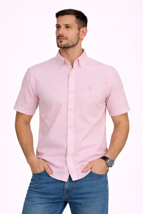 Camisa Masculina Slim Maquinetada Rosa Manga Curta com Botão na Gola Caw