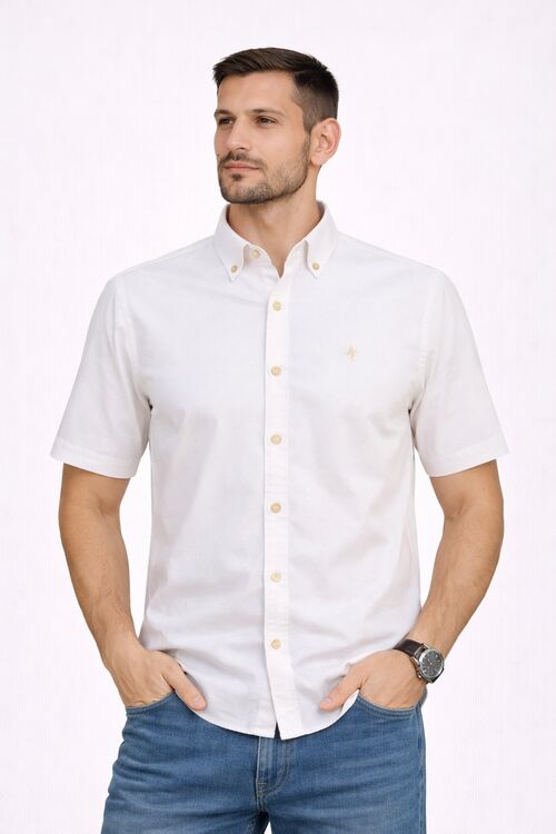 Home / Masculino / Camisas Masculinas / Camisa Casual Manga Curta / Camisa Masculina Slim Maquinetada Branco Manga Curta com Botão na Gola Caw